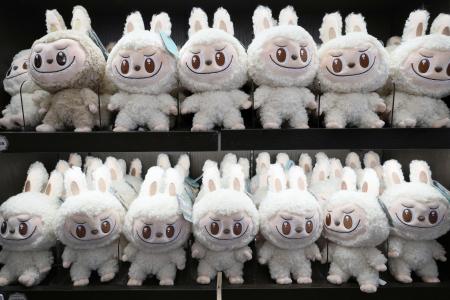 ポップマートの店舗に並ぶ「ラブブ」のぬいぐるみ=2025年5月、北京(共同)
