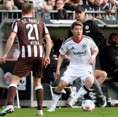 ザンクトパウリ戦でプレーするEフランクフルトの堂安(右)=ハンブルク(共同)