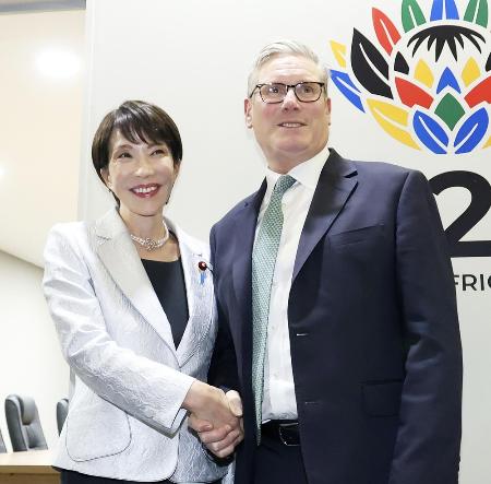 スターマー英首相(右)と握手する高市首相=2025年11月、南アフリカのヨハネスブルク(共同)