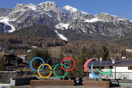 積雪の少ないコルティナダンペッツォ市内に掲げられた五輪とパラリンピックのモニュメント=2025年12月