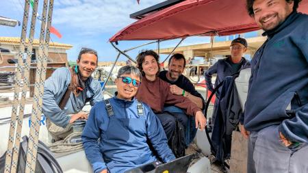 パレスチナ自治区ガザへの支援船団に参加予定の武本匡弘さん(左から2人目)=イタリア南部シチリア島(本人提供・共同)