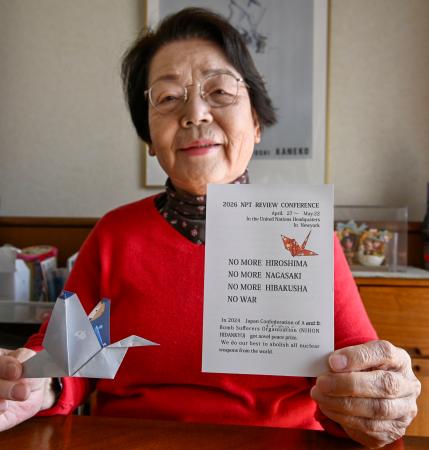 米ニューヨーク滞在中に配る予定のはがきを持つ今井セイ子さん=3月、大阪府寝屋川市