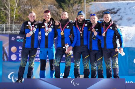 バイアスロン男子7・5キロ視覚障害で表彰台を独占したウクライナ勢=7日、イタリア・テーゼロ(共同)