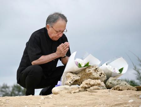 沖縄県名護市辺野古沖での転覆事故の現場を臨む「瀬嵩の浜」で手を合わせる玉城デニー知事=21日午後