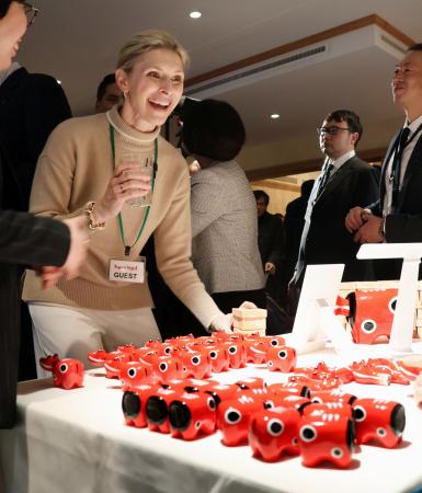 福島県の郷土玩具「赤べこ」を前に笑顔を見せる来場者=21日、スイス東部ダボス(共同)