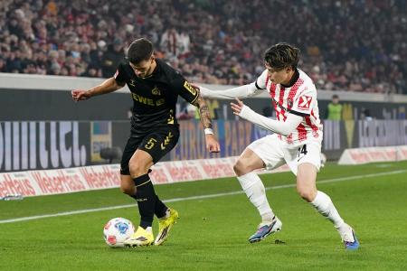 ケルン戦で競り合うフライブルクの鈴木唯人(右)=25日、フライブルク(ゲッティ=共同)