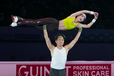 エキシビションで演技するペアの長岡柚奈(上)、森口澄士組=北京(共同)