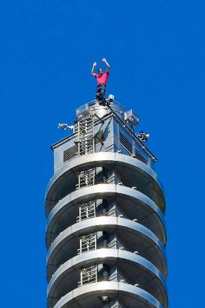 「台北101」を登り切って手を振るオノルドさん=25日、台北(中央通信社=共同)