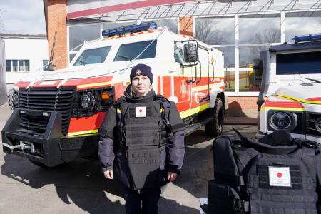 女性向けの防護服を着るウクライナ非常事態庁関係者=6日、キーウ(共同)