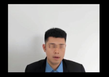 ビデオ通話で話すニセの警察官(長崎県警提供、顔に画像加工しています)