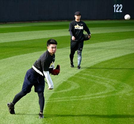 合同自主練習でキャッチボールする阪神・石井(手前)=沖縄県宜野座村