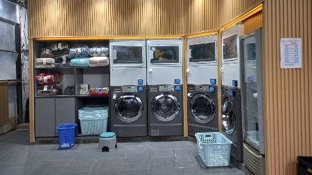 洗濯設備が並ぶジャカルタ首都圏のセルフランドリーの店内=10月13日