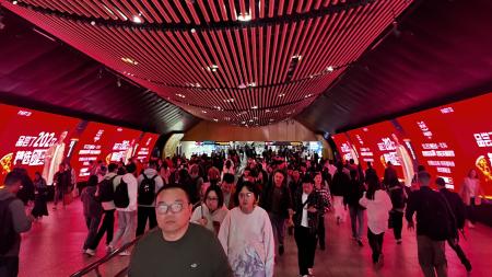 「双十一」の広告が両側の壁に並ぶ上海市の地下鉄駅構内=10月31日