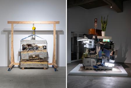 Chim↑Pom from Smappa!Group「カッティング・ビルバーガー」2025 ミクストメディア(学士会館新館から切り出されたフロアの床、各階の残留物)(左)、「ビルバーガー」2025 ミクストメディア(神田通信機株式会社本社ビルから切り出されたフロアの床、各階の残留物)(撮影:森田兼次)(提供写真)