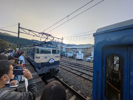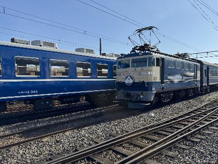 仕業を控えた青い機関車と12系客車(左)。右の客車は同系色の旧型客車