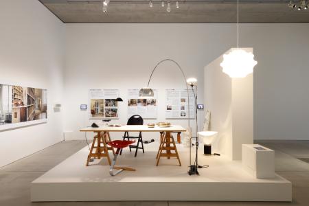 アキッレ・カスティリオーニさんの展示スペース。中央の湾曲した照明器具が「アルコ」=東京・六本木(撮影:木奥恵三)(提供写真)
