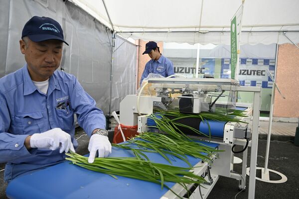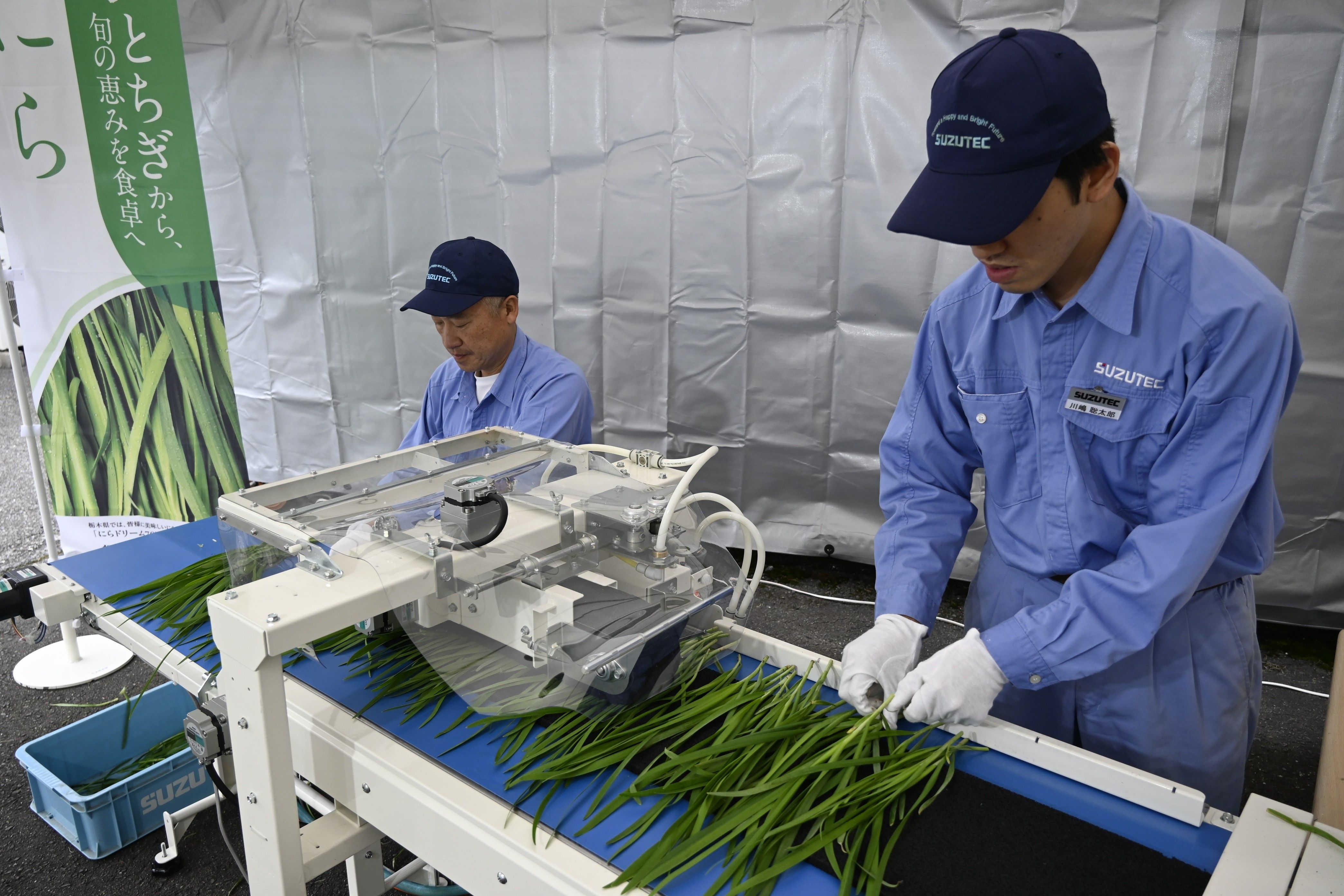 開発した「ニラそぐり機」で作業を実演するスズテック社員=21日、宇都宮市平出工業団地