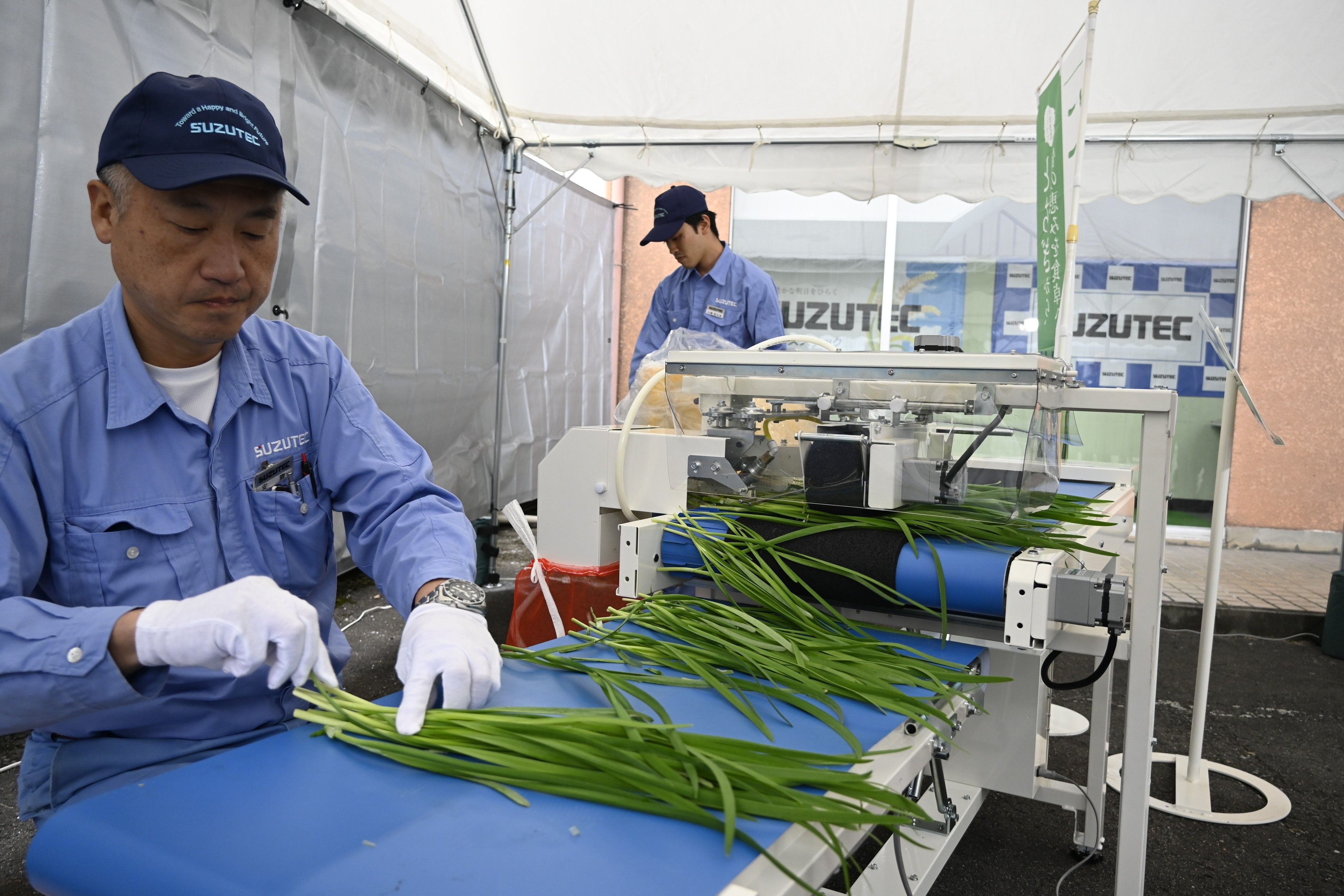 開発した「ニラそぐり機」で作業を実演するスズテック社員