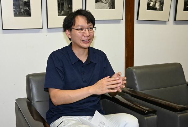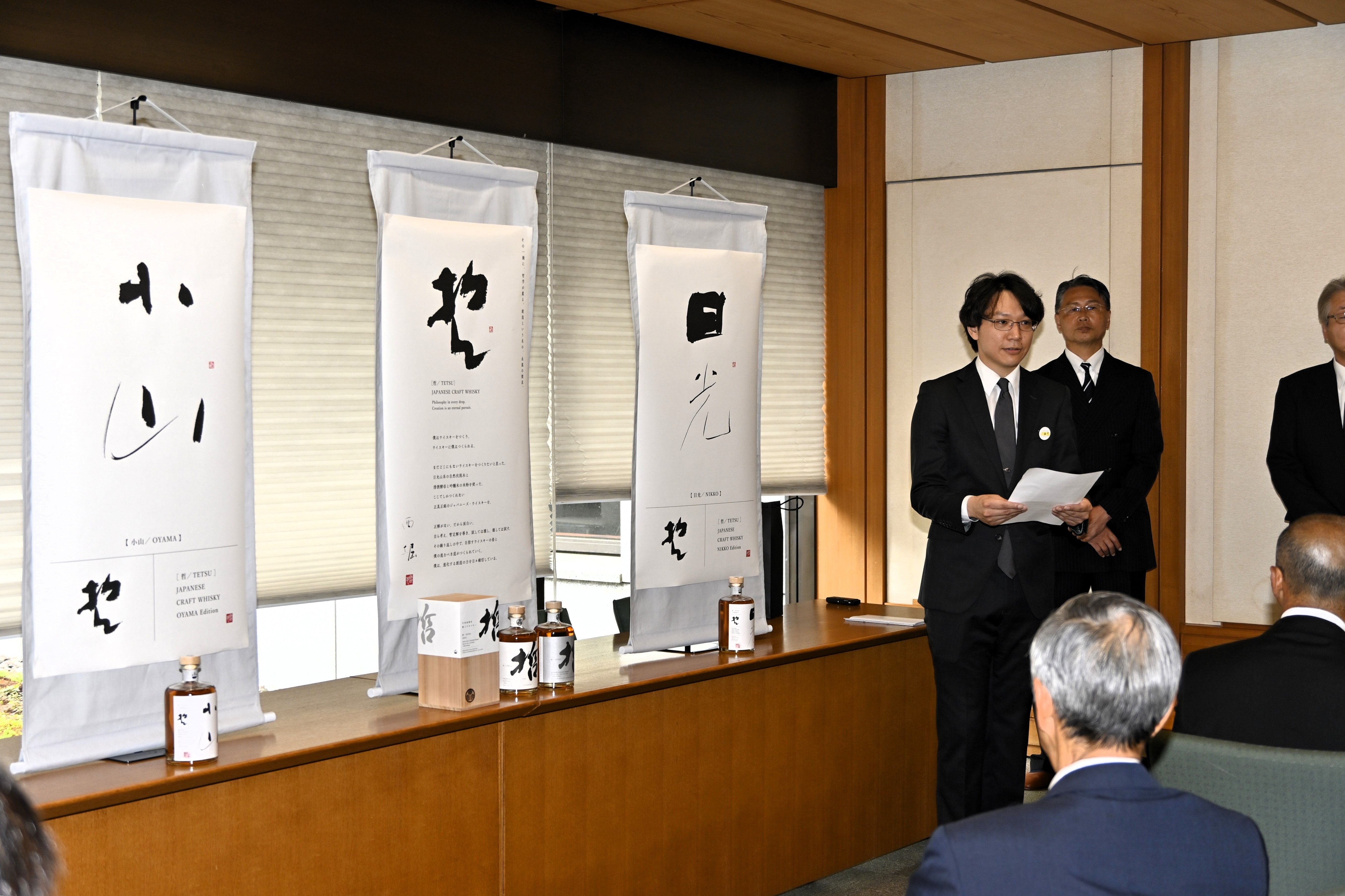 日光東照宮への献上祭前にブランド「哲-TETSU-」について説明する西堀哲也専務=7月、日光市