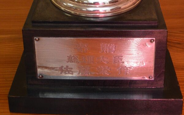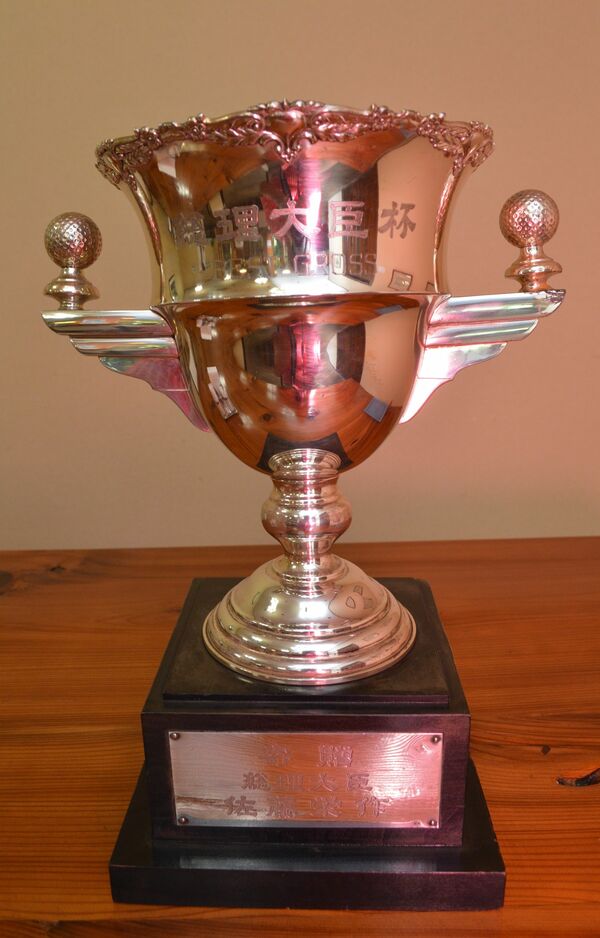 個人ベストグロスが手にする「総理大臣杯」と刻印された優勝カップ