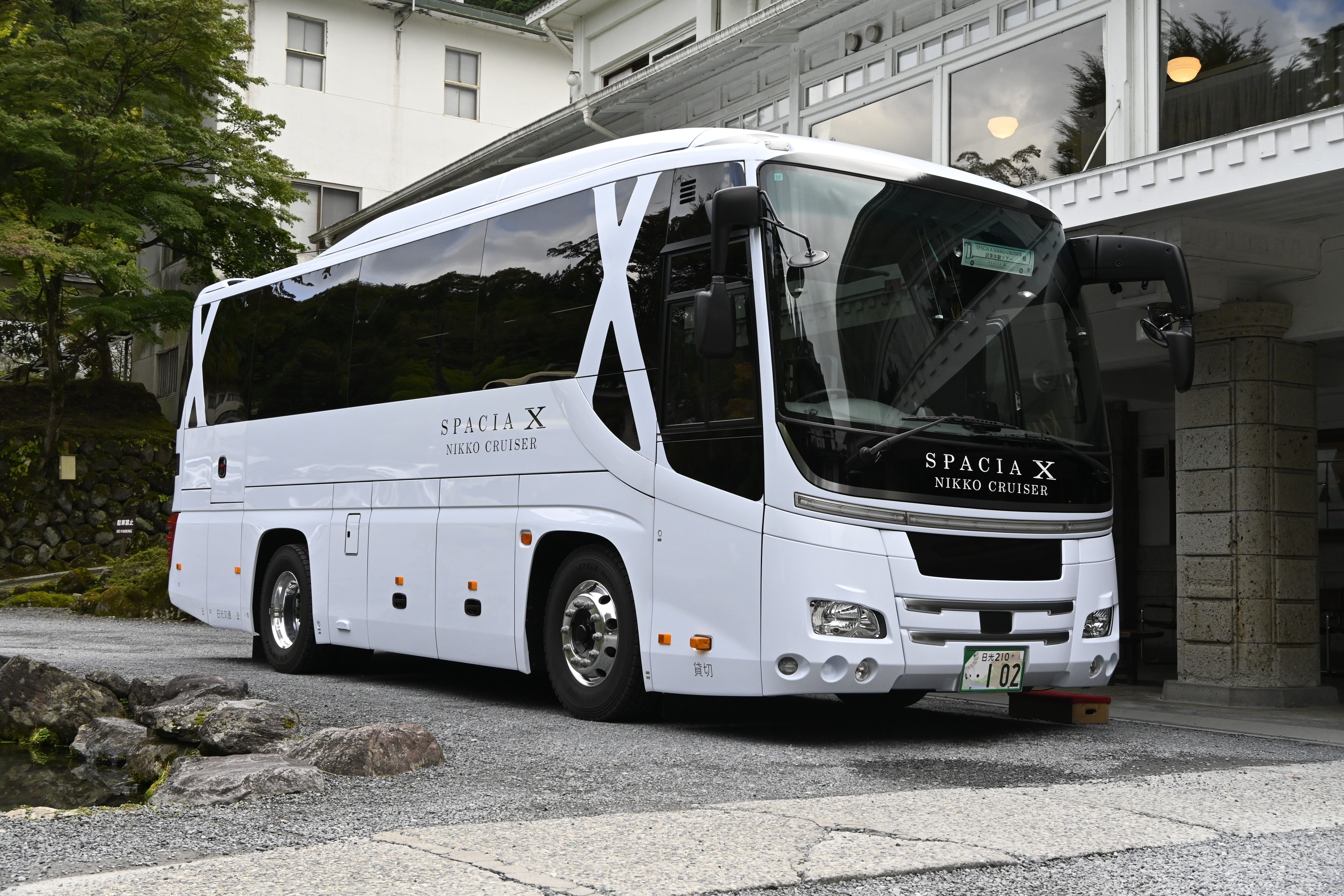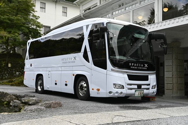 新たに運行を始めるハイグレード貸し切りバス「スペーシアXニッコウクルーザー」=15日午後、日光市