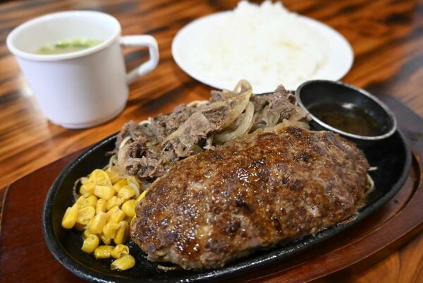 ボリューム満点の「ハンバーグ+牛肉鉄板焼きセット」