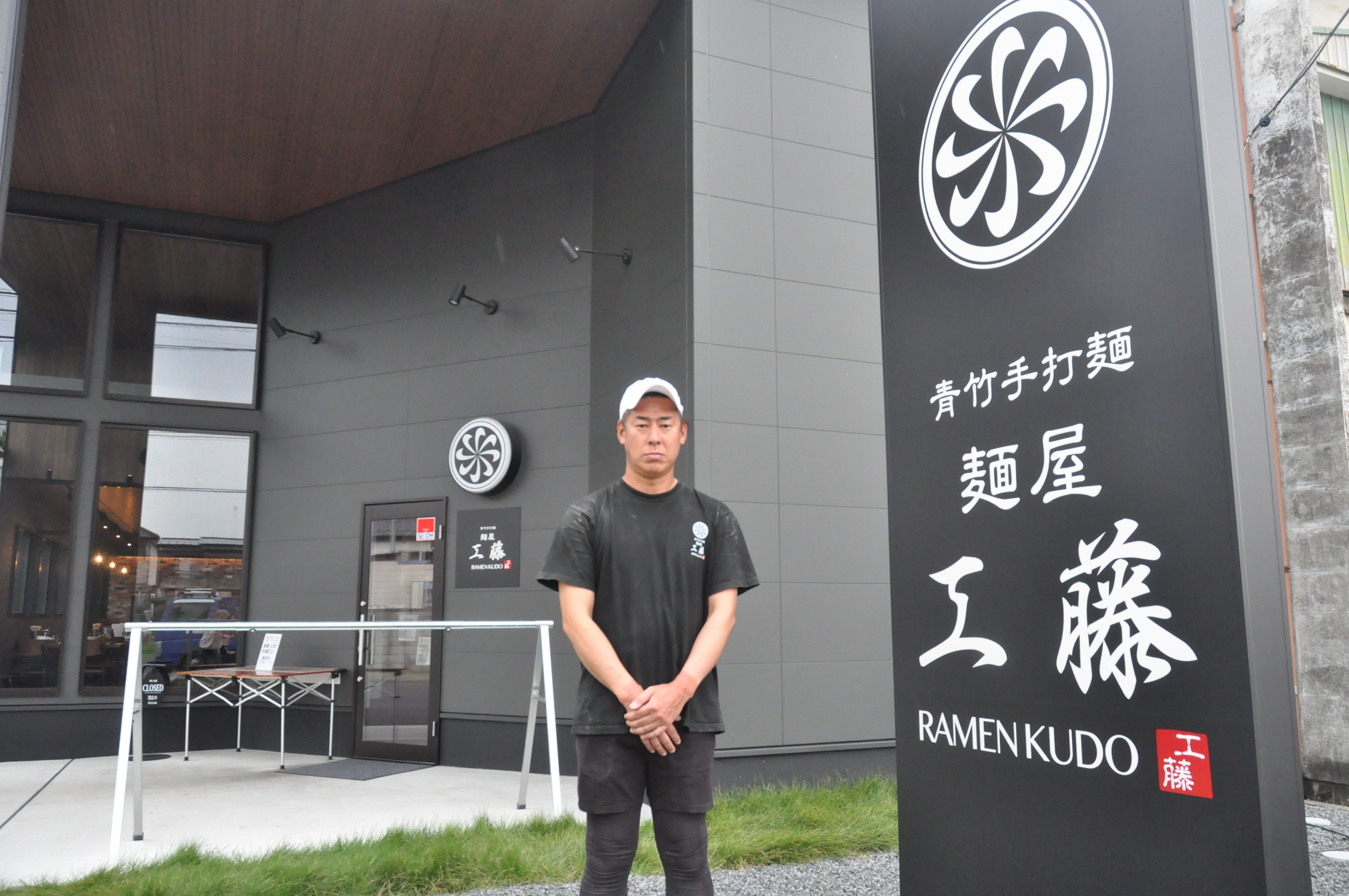 モダンな新築の店舗の前に立つ店主の工藤さん
