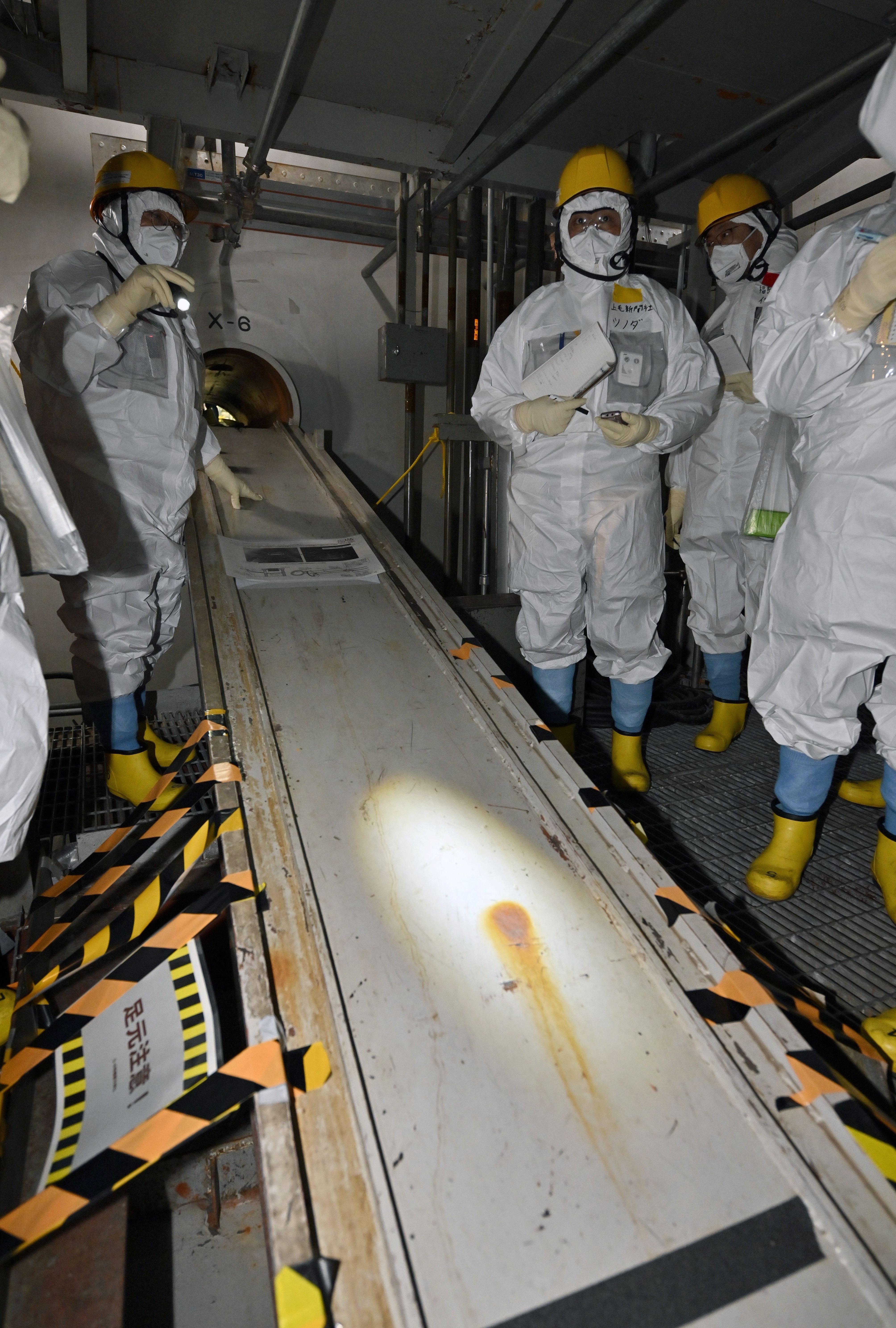 格納容器の内側で貫通孔を視察する記者たち=午後1時50分、福島県双葉町