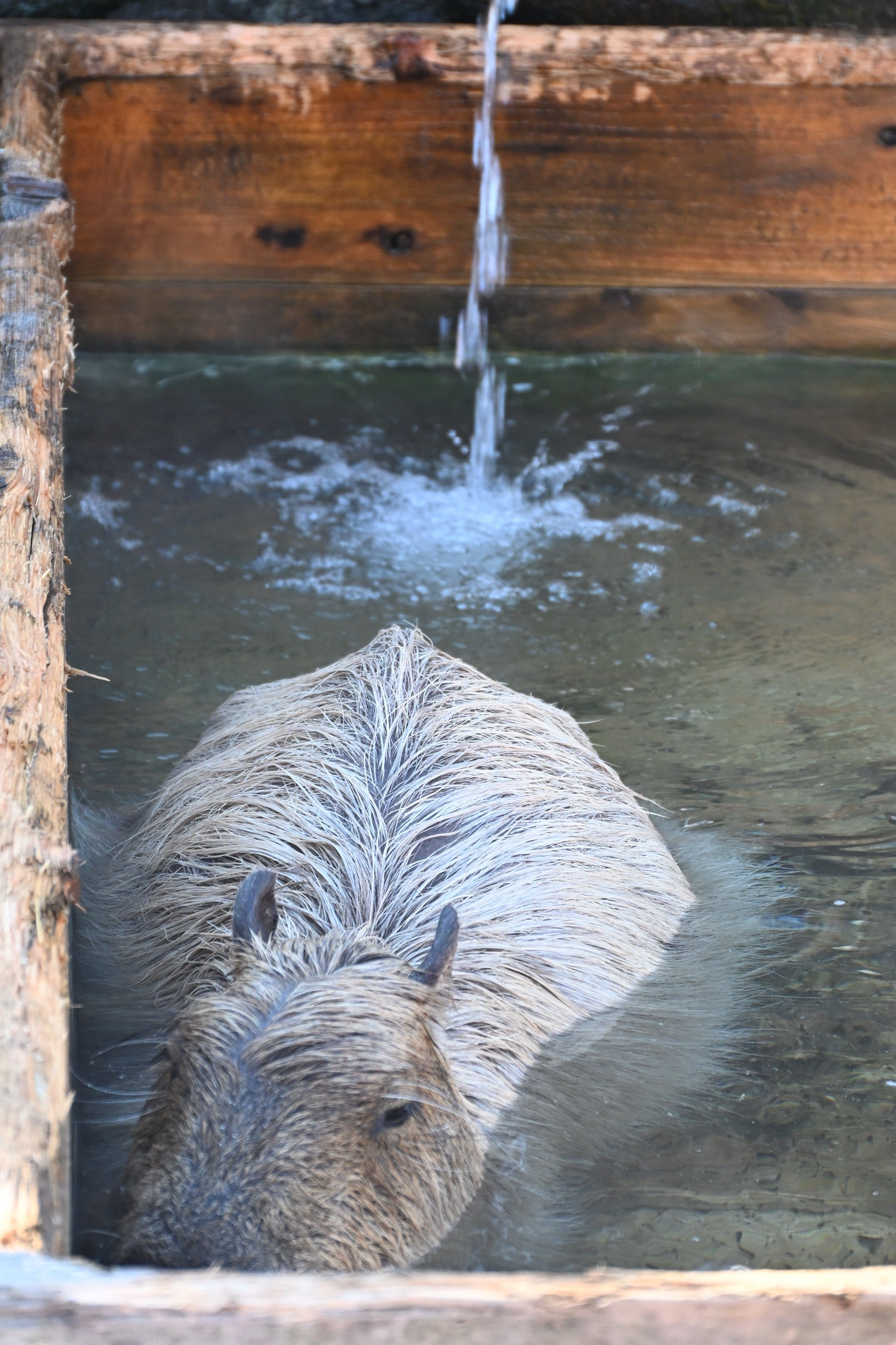 露天風呂に漬かる「こはる」=10日午前11時20分ごろ、那須町大島