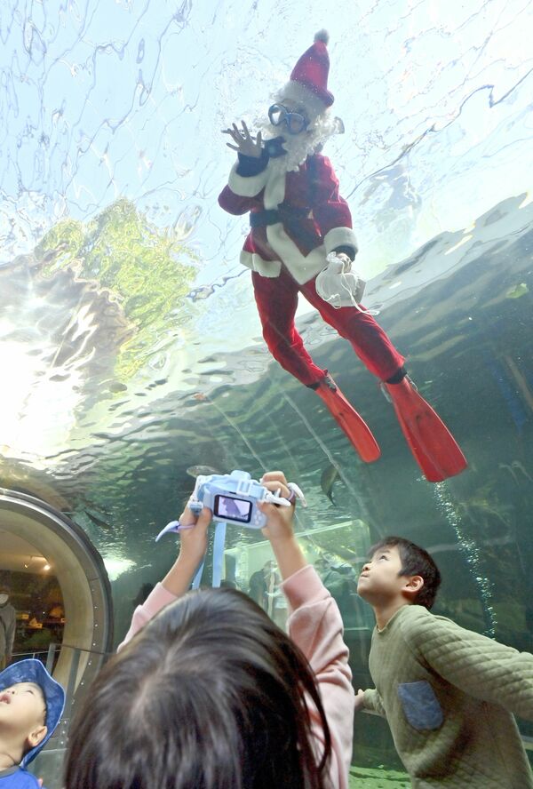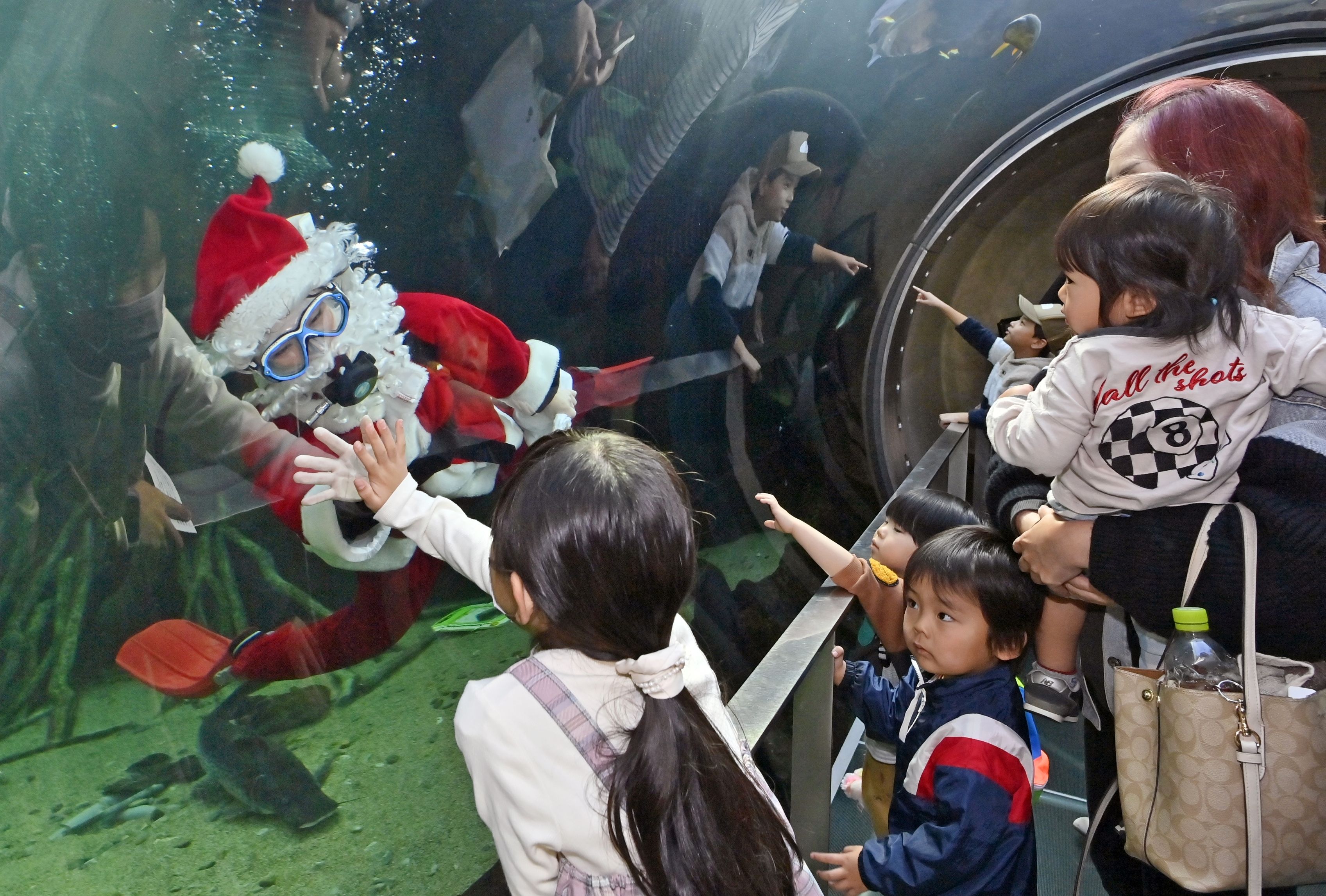 来園客の目をくぎ付けにした水中マスク姿のサンタクロース=7日午前11時25分、大田原市佐良土