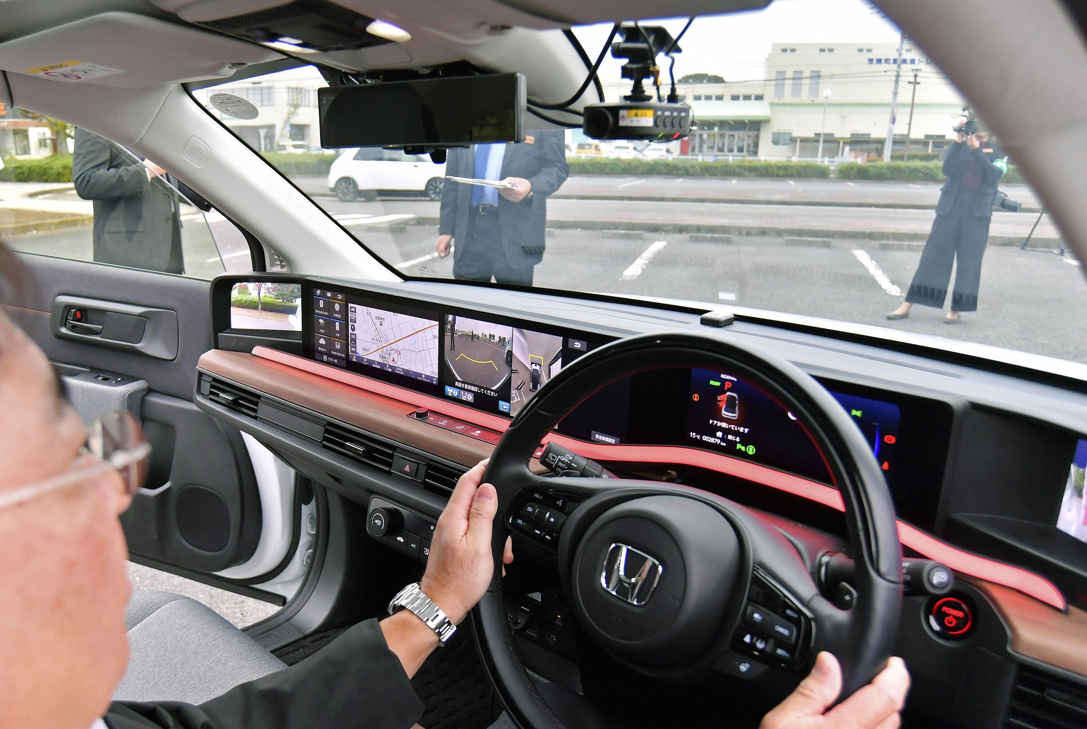 ドライブレコーダー型の運転支援システム(右上)。危険を予測するとダッシュボードのランプが赤く光る=22日午後、芳賀町役場
