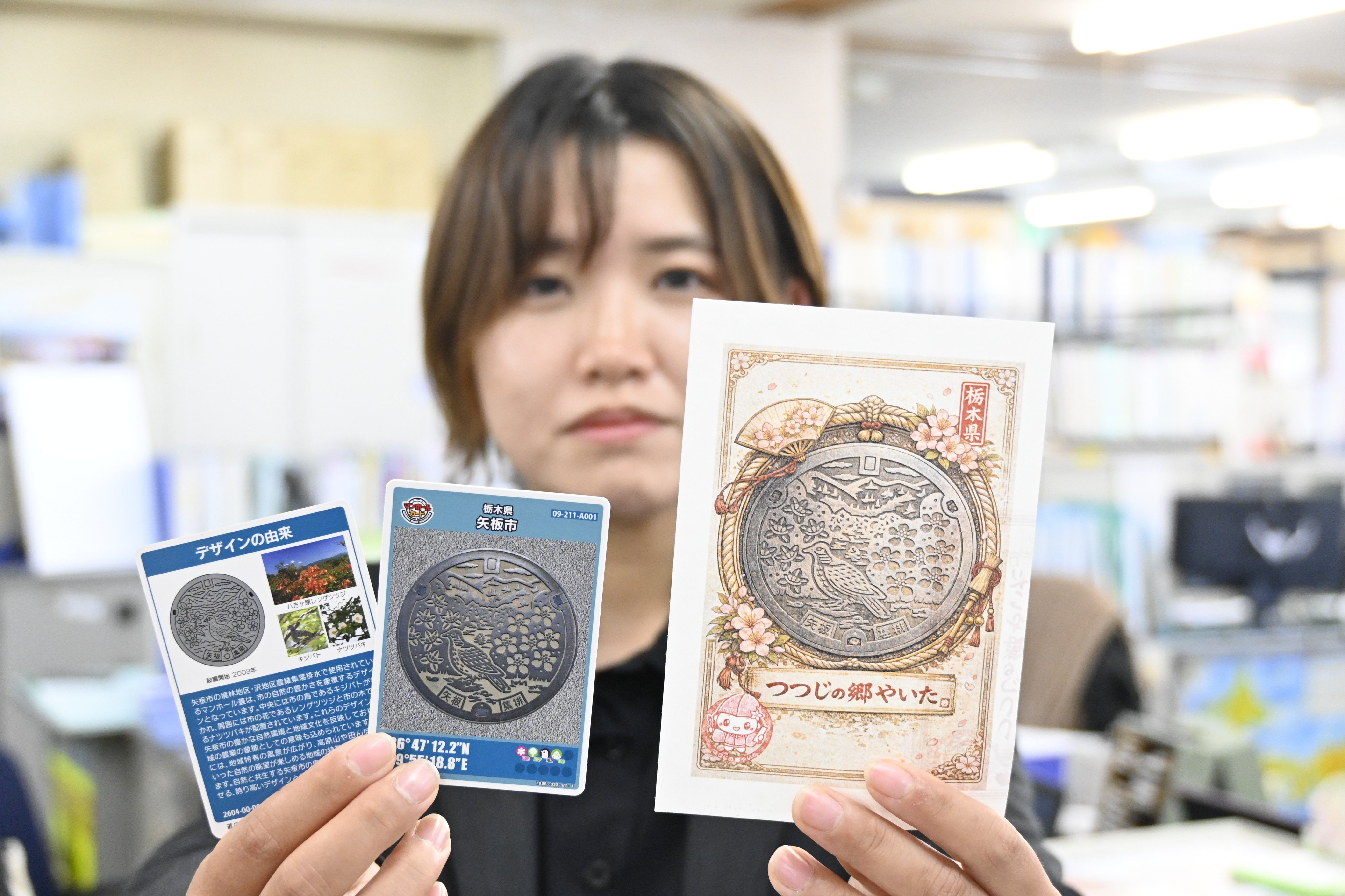 道の駅やいたで24日から配布するマンホールカード(左)と御蓋印