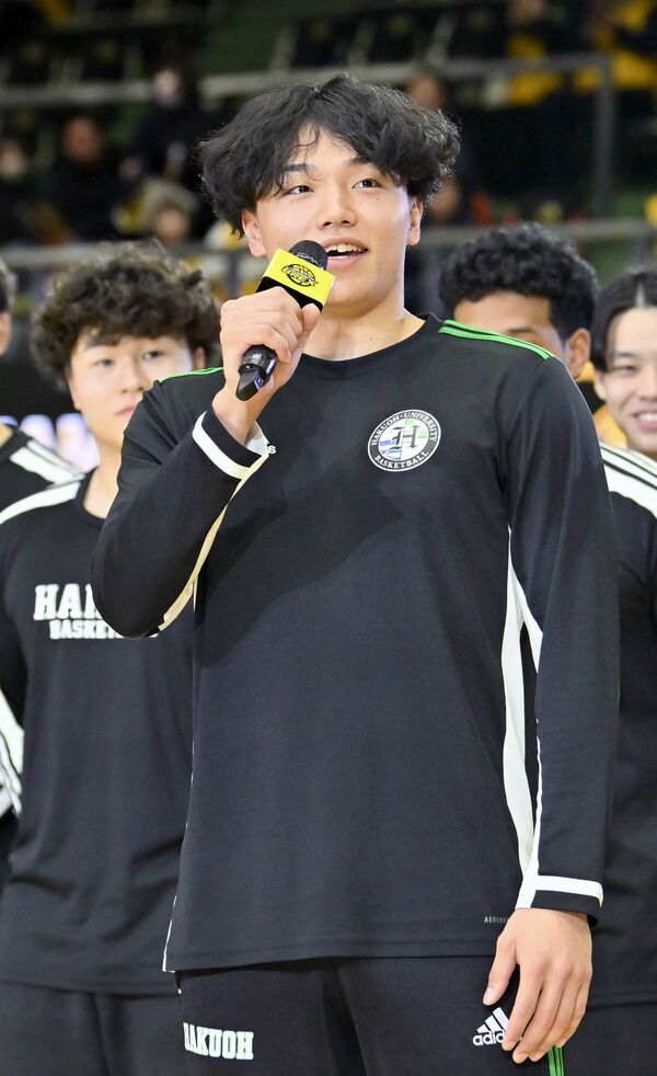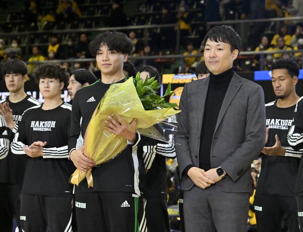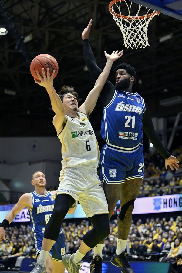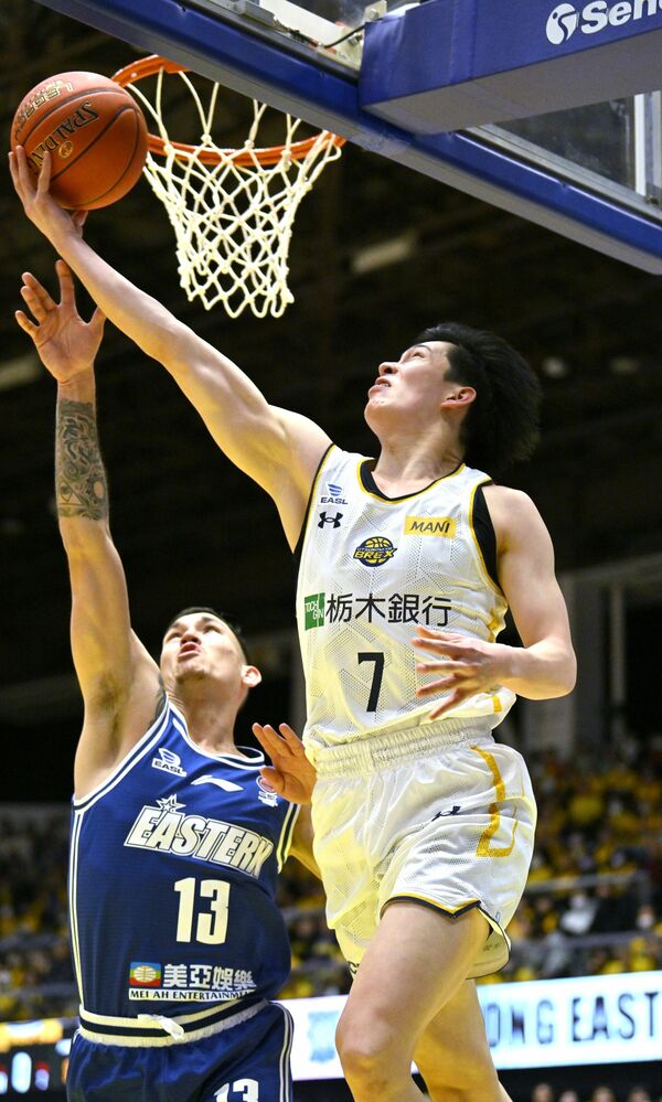 第2クオーター1分、ブレックスの比江島(左)がシュートを決める=ブレックスアリーナ宇都宮、磯真奈美撮影