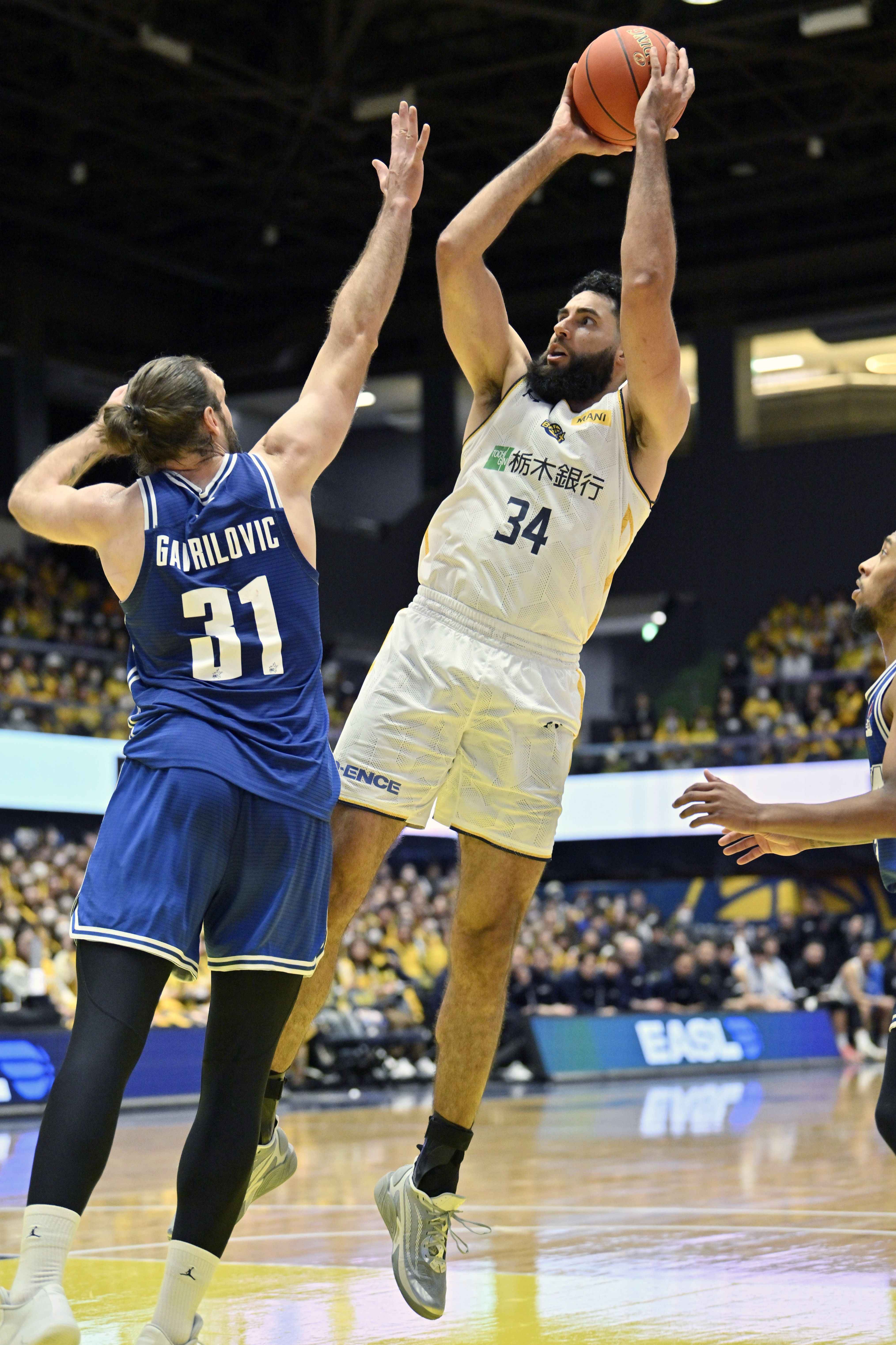 第4クオーター4分、ブレックスのジェレット(右)がシュートを放つ=ブレックスアリーナ宇都宮、磯真奈美撮影