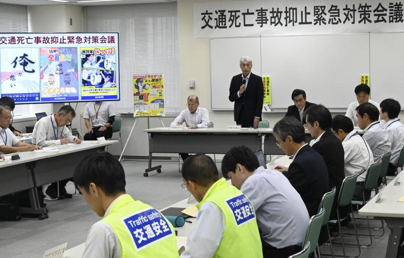 緊急対策会議で死亡事故防止に協力を呼びかける杉本本部長(中央)=9日午後、県警本部
