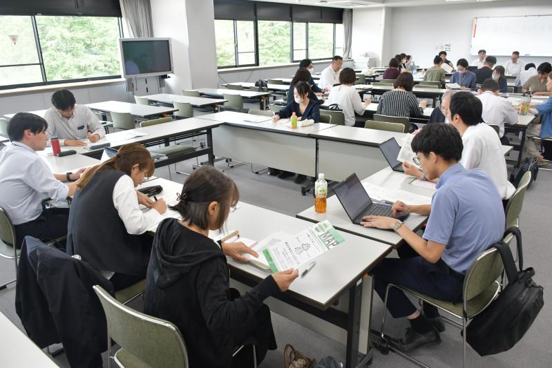 不登校対策の連携強化に向け、地区ごとに相互理解を図る参加者ら=7日午前、県総合教育センター