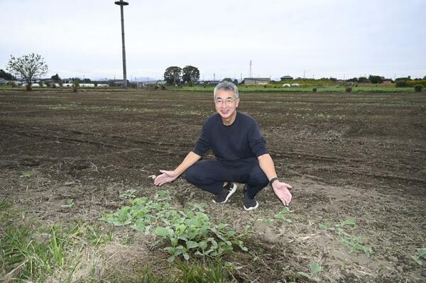 ユウガオの栽培で地面に敷くために保管するわらの束と葭葉さん夫妻