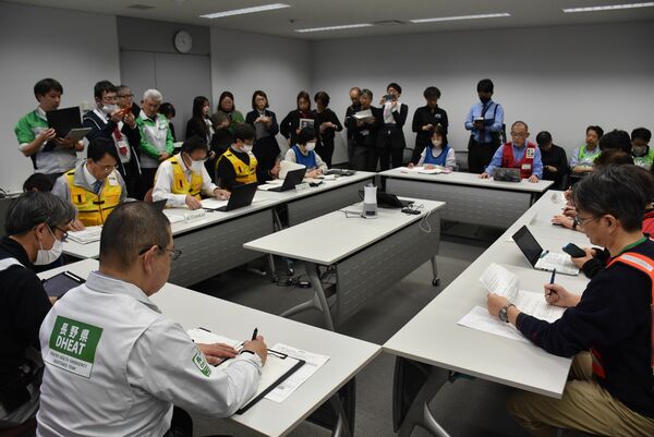 災害時の連携や調整などをテーマに訓練する医療や福祉の関係者=14日午前、県庁