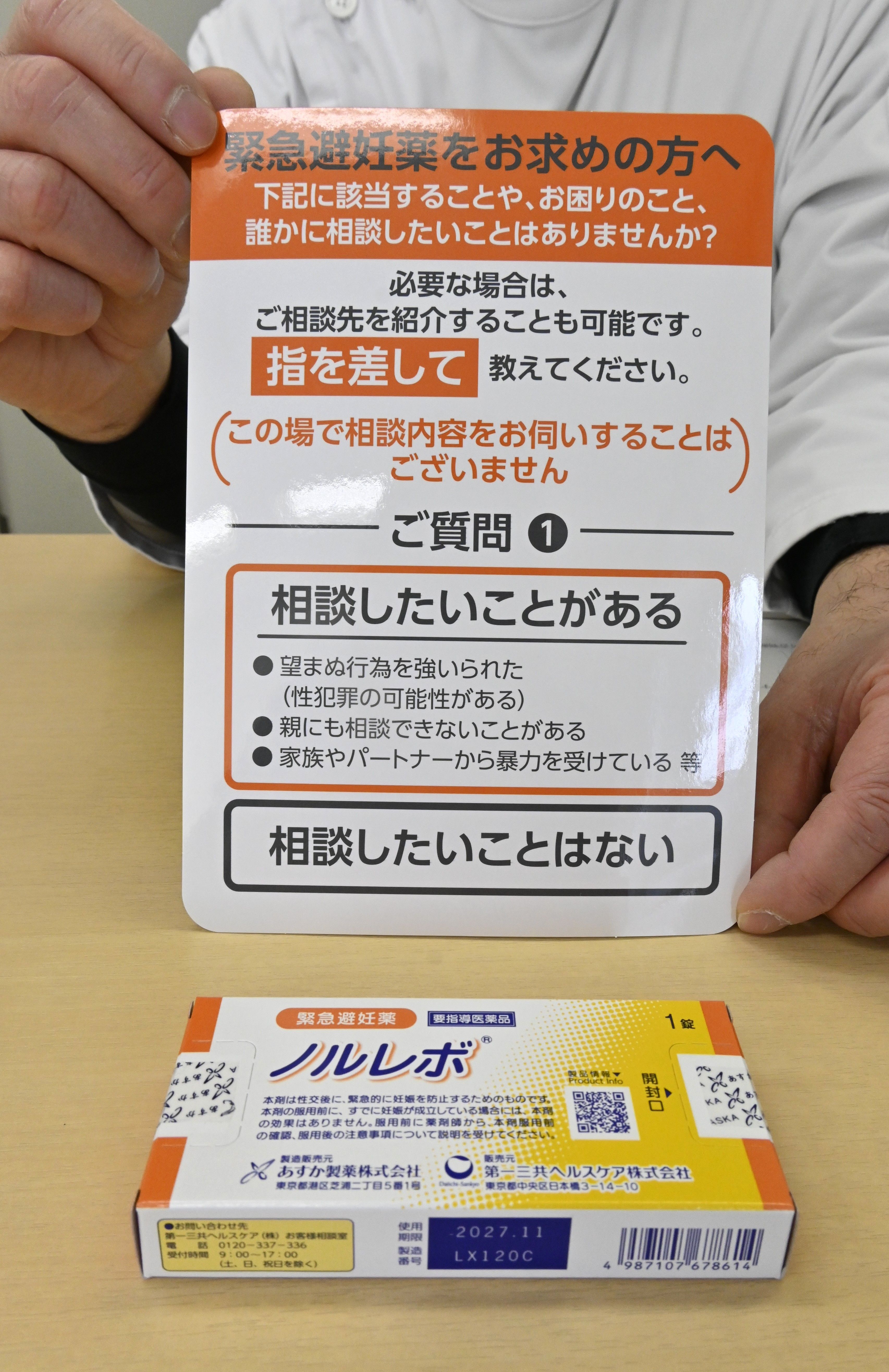市販が始まった緊急避妊薬「ノルレボ」。薬剤師は指さし確認シートなどを活用して購入希望者とやりとりをする=2月上旬、足利市花園町