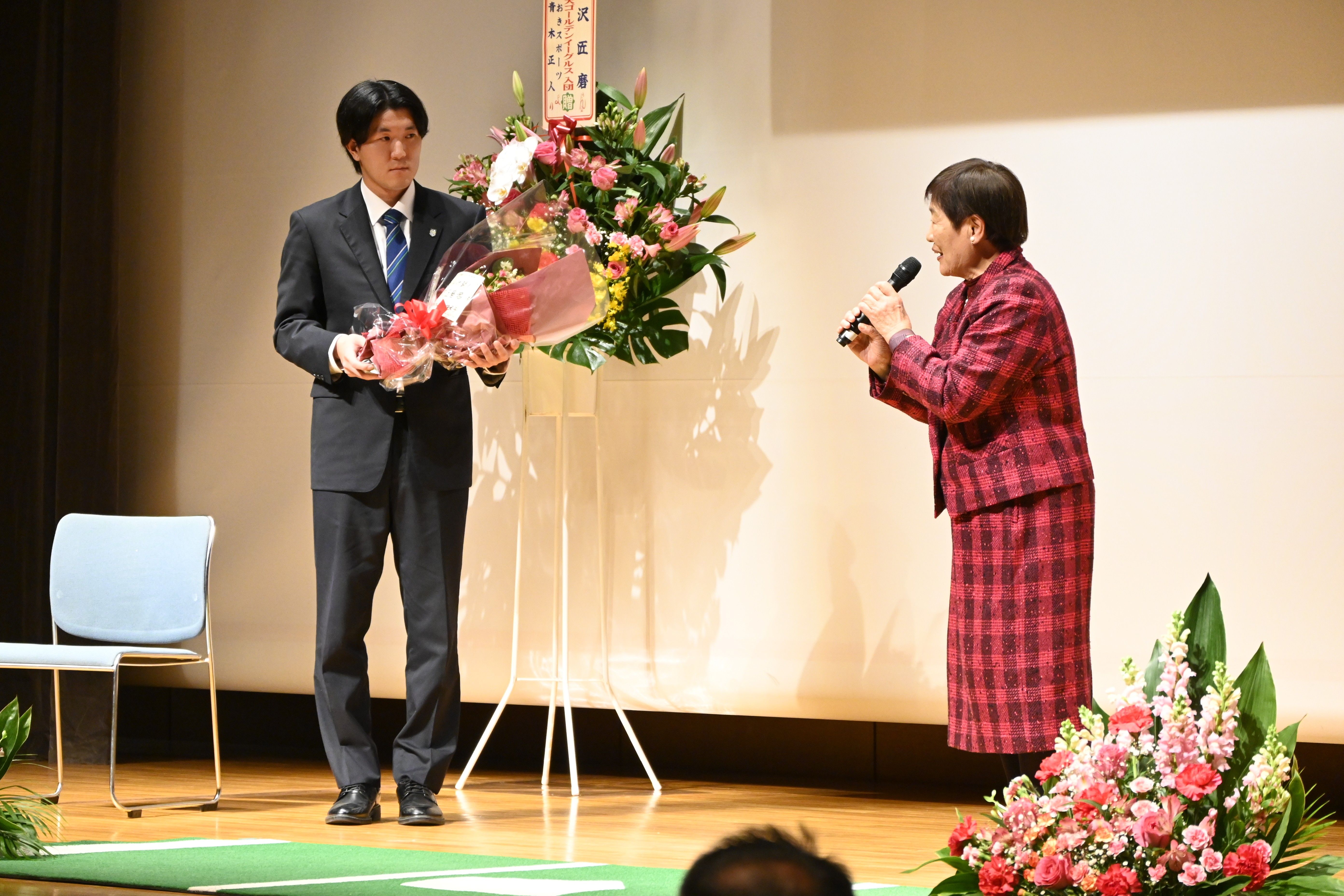 真瀬町長から激励の言葉を受ける中沢投手(左)