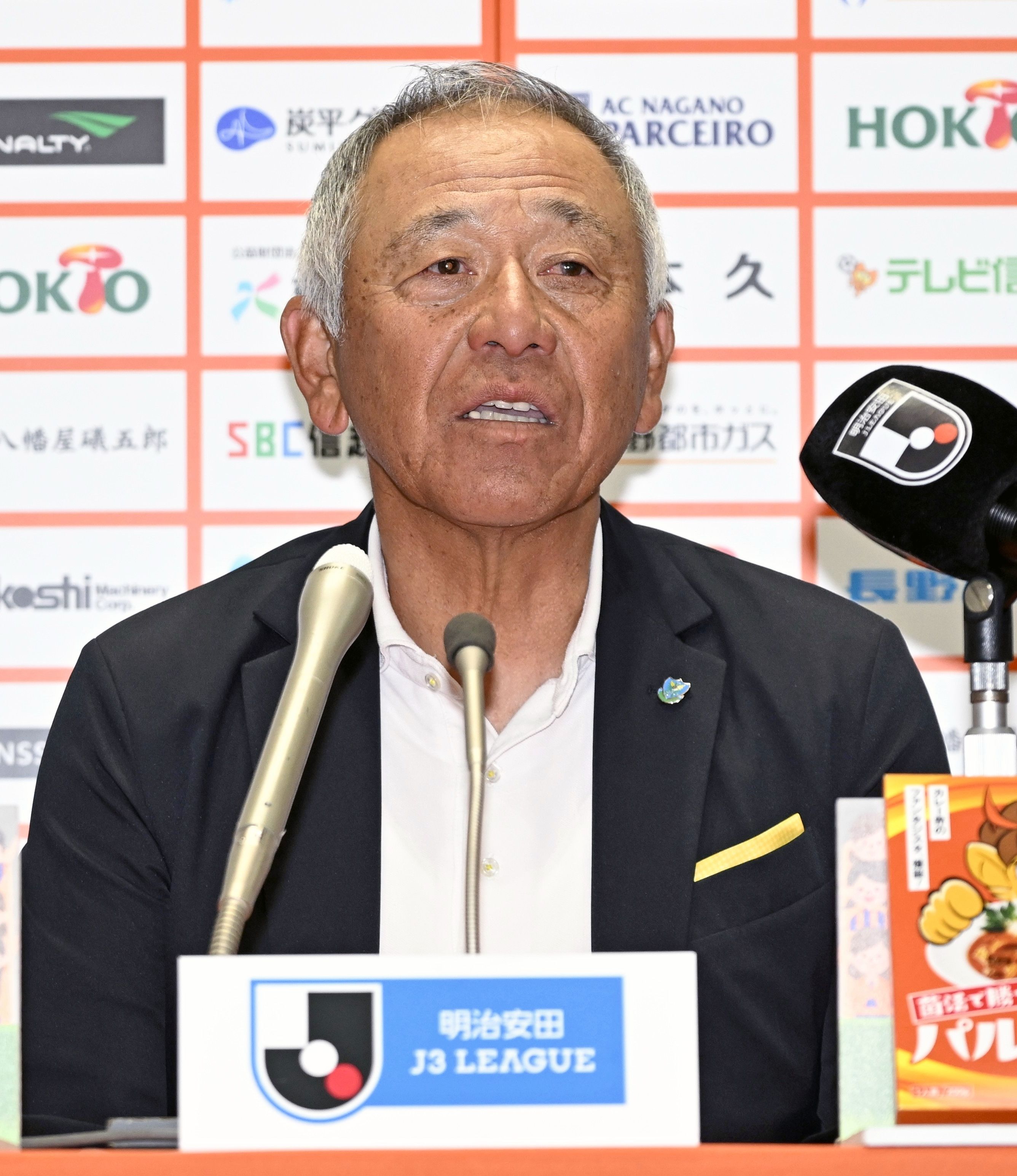 最終戦を終え、記者会見で今季を振り返る栃木SCの小林監督=長野Uスタジアム、森田大地撮影