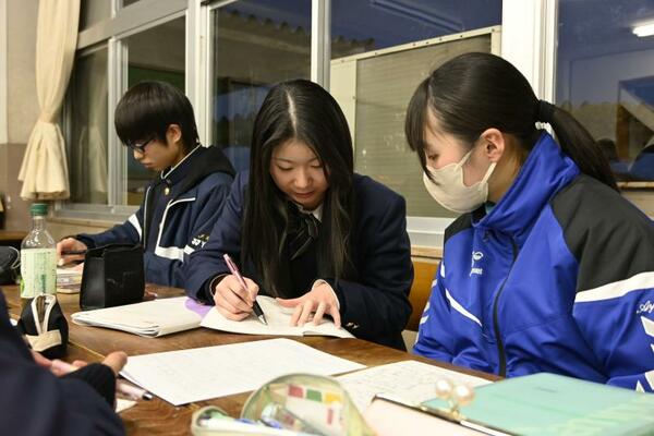 K-STUDYで黒磯高の生徒(中央)から勉強を教わる黒磯中の生徒(右)
