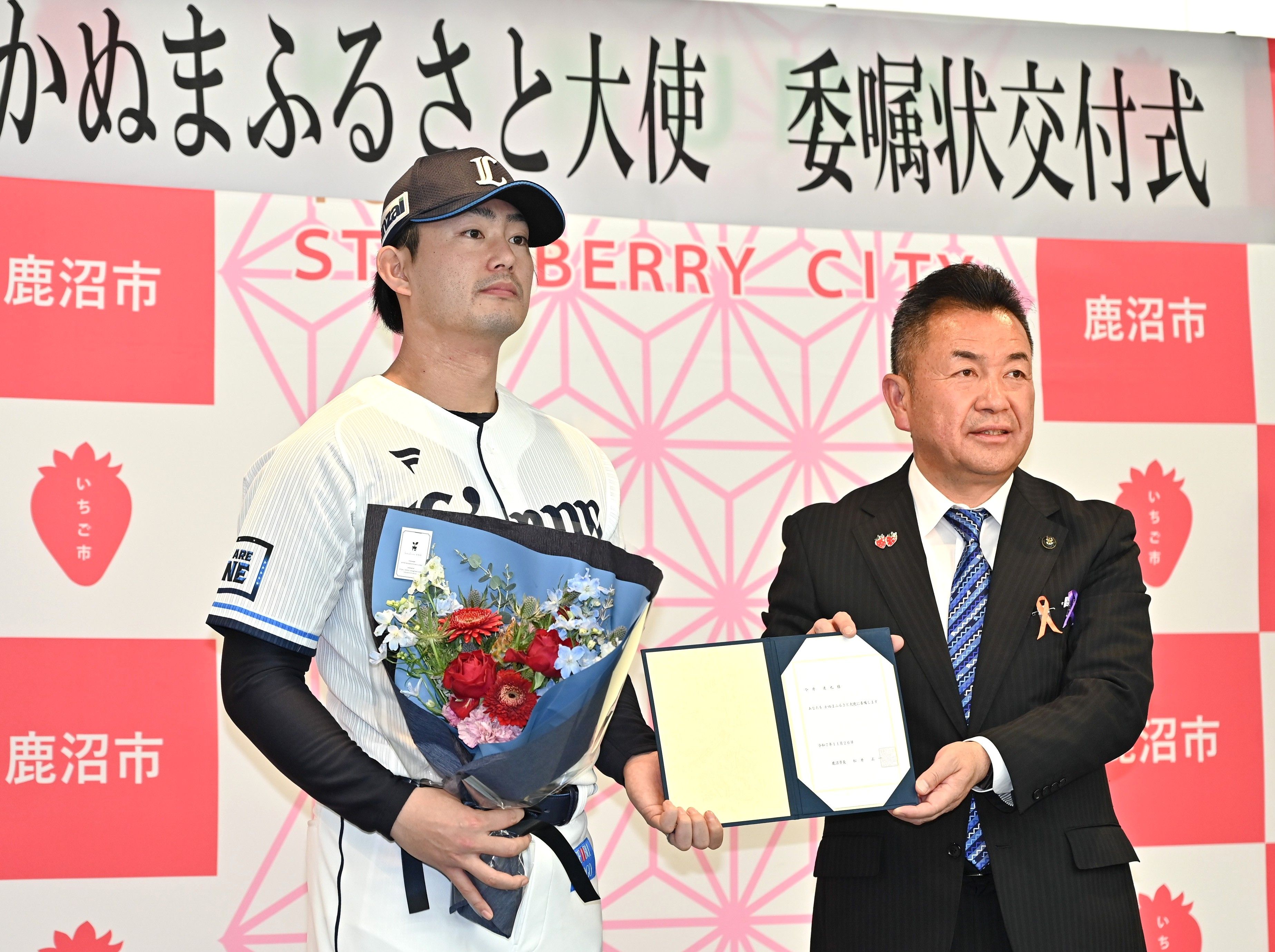 松井市長(右)から委嘱状を受け取る西武の今井投手=26日午後、鹿沼市坂田山2丁目