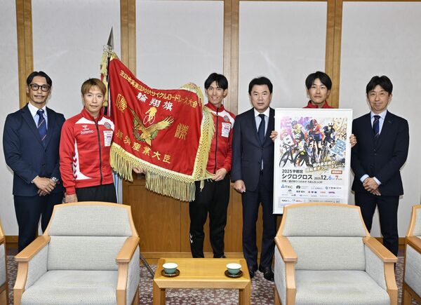 今季の活動を佐藤市長(右から3人目)に報告したブリッツェン一行=宇都宮市役所