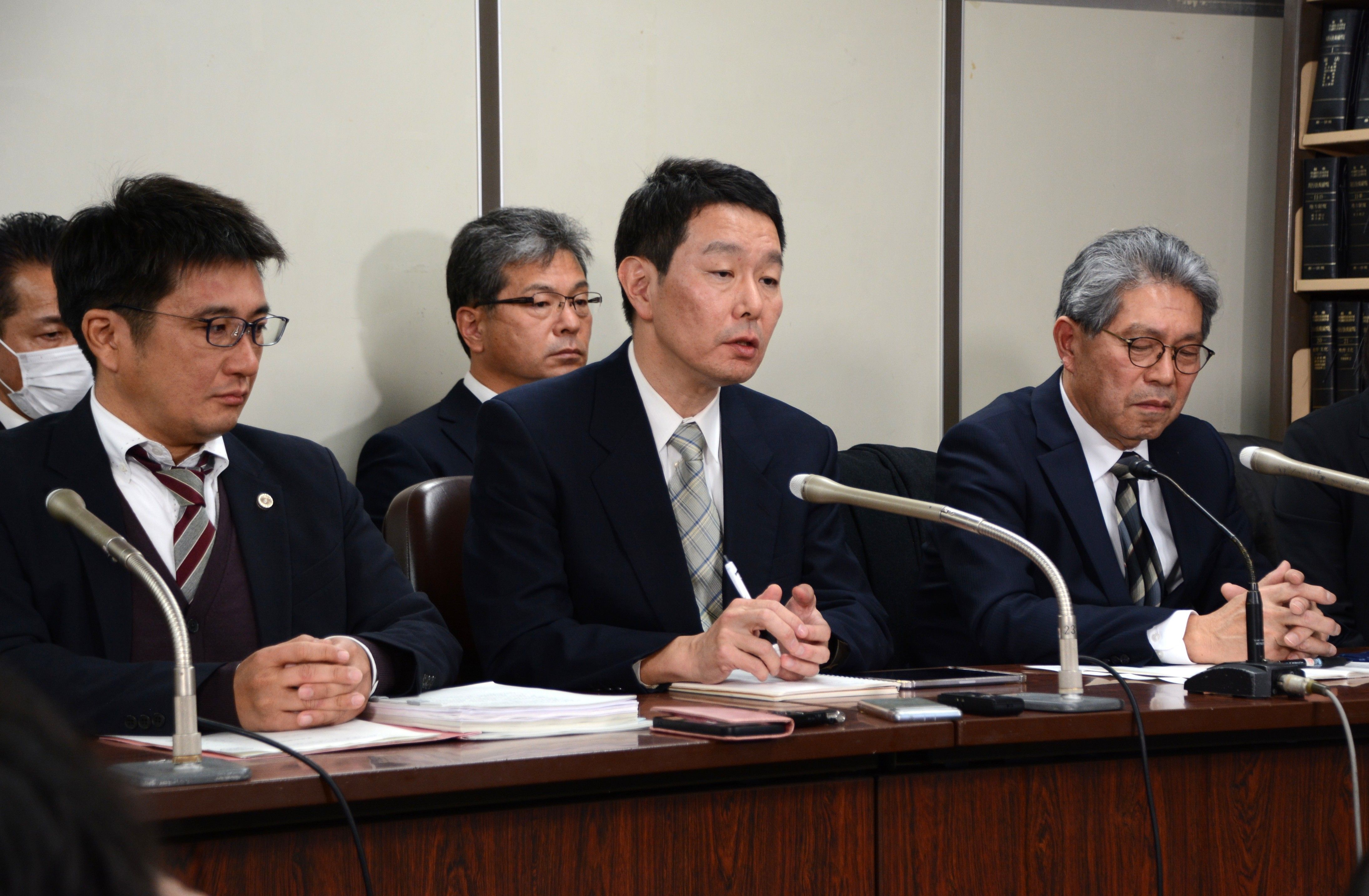 記者会見に臨む奥さん(右から2人目)や毛塚さん(右端)ら=9日午後5時、東京・霞が関の司法記者クラブ