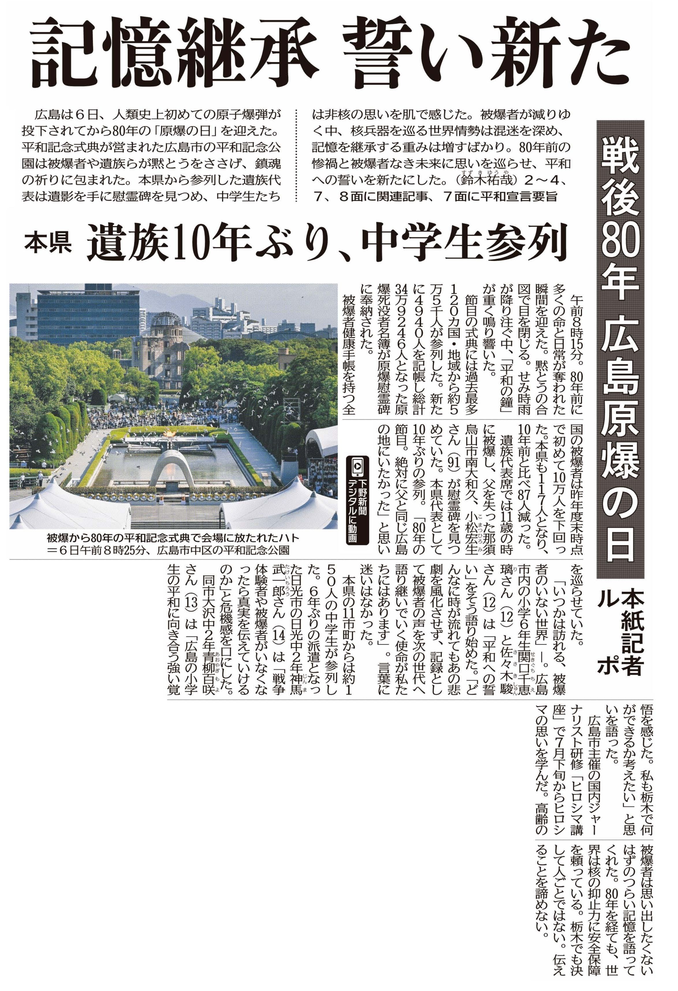 鈴木記者が執筆し、松本さんが思いをまとめた「広島原爆の日」の本紙記者ルポ(2025年8月7日付)