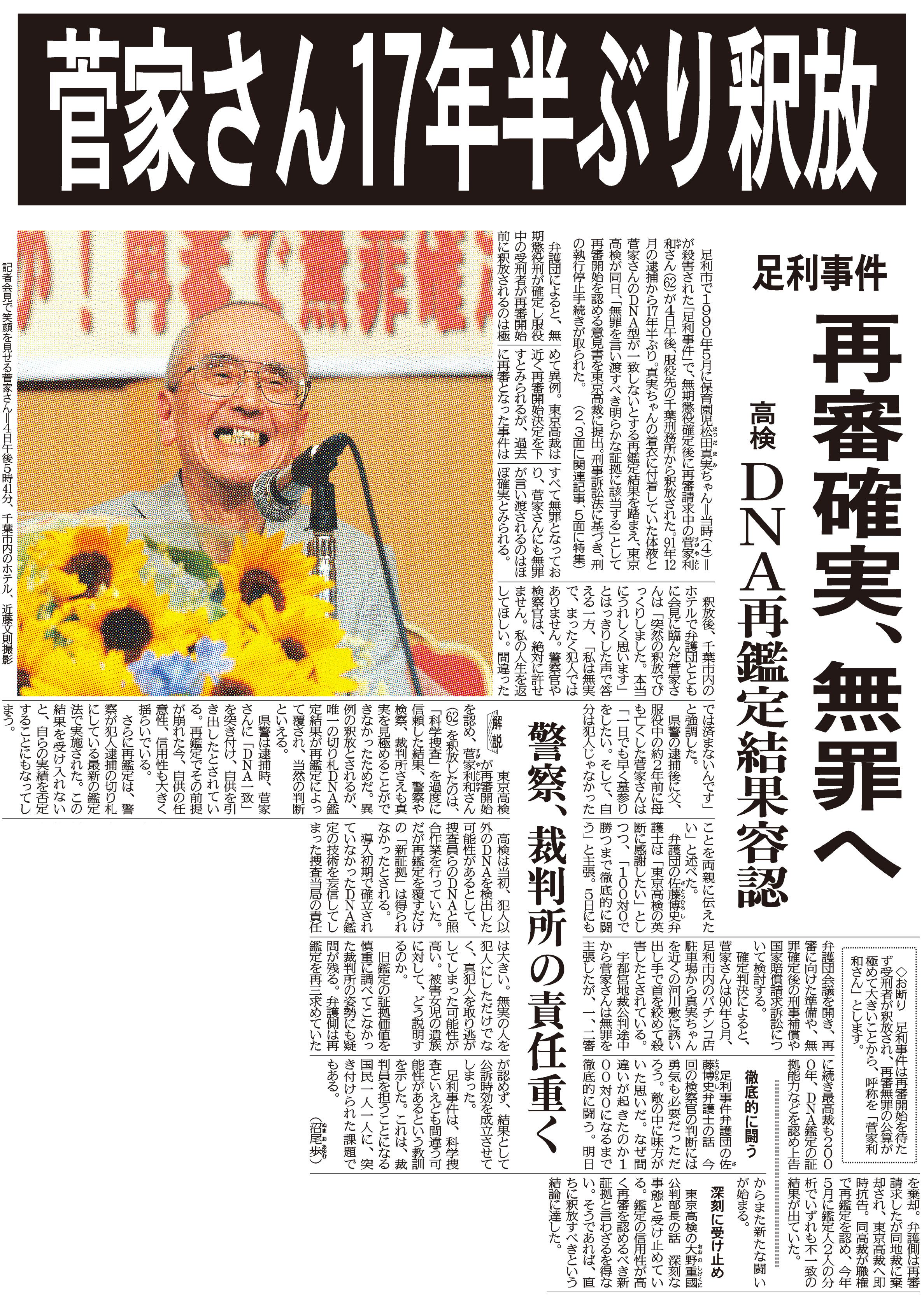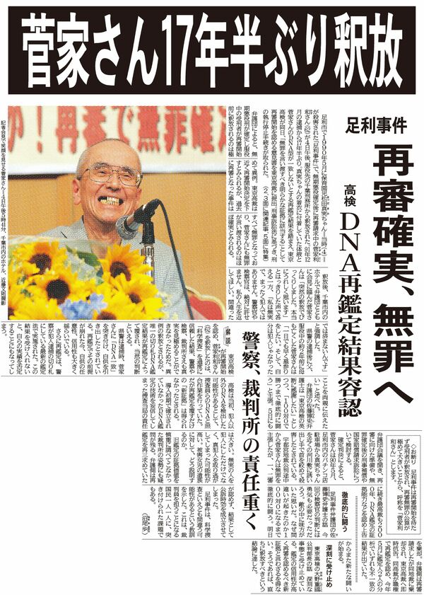 DNA型の再鑑定結果を踏まえた、菅家さんの17年半ぶりの釈放を伝える本紙記事(2009年6月5日付)