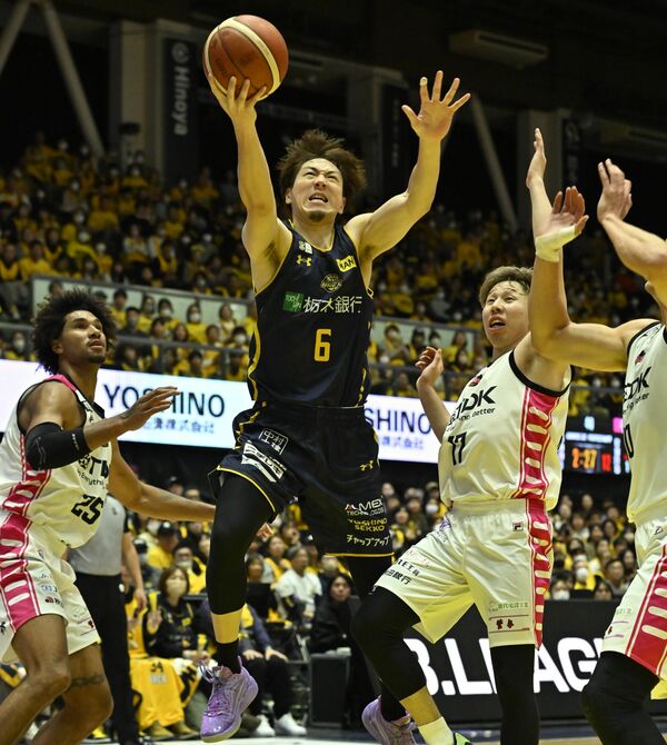 第4クオーター8分、ブレックスの比江島が3人の守備を振り切り、レイアップシュートを決める=ブレックスアリーナ宇都宮