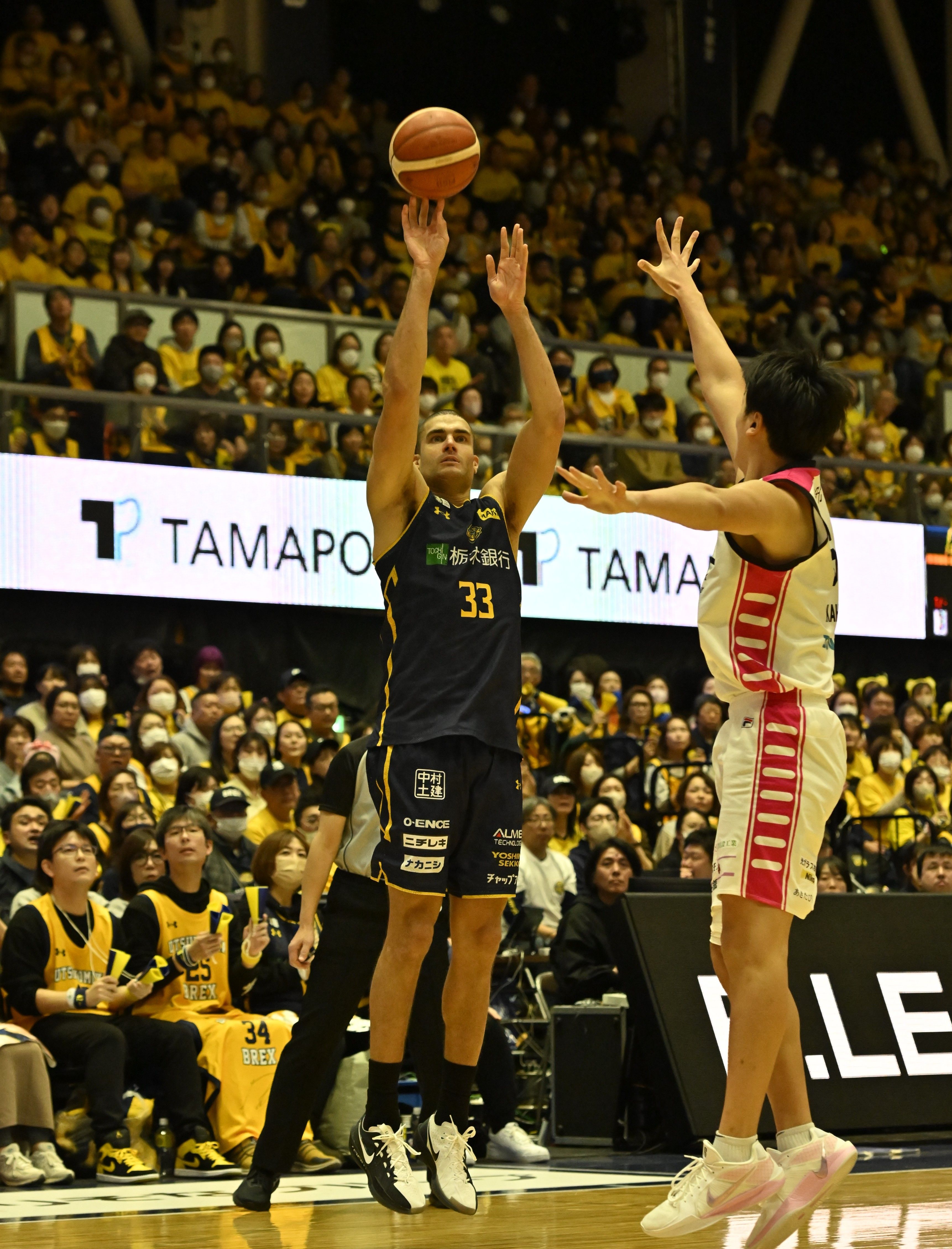 延長1分、ブレックスのエドワーズが3点シュートを決める=ブレックスアリーナ宇都宮