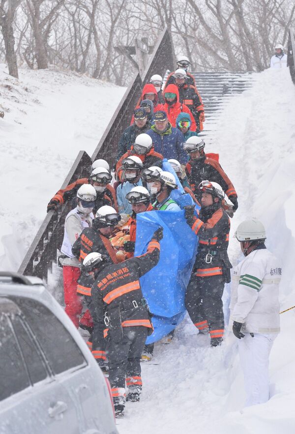 那須雪崩事故の発生後、繰り返し重傷者を搬送する救助隊員=2017年3月27日午後5時35分、那須町湯本